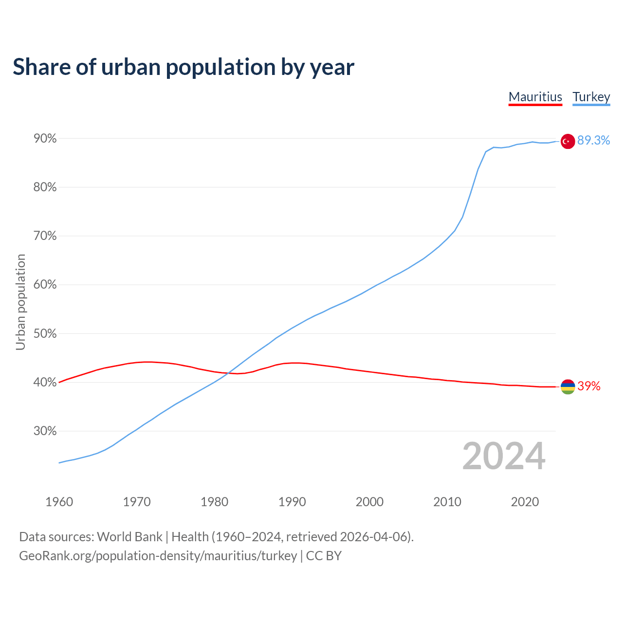 From 2004 to 2024, the share of urban population changed from 41.3% to 39% in Mauritius and from 62.4% to 89.3% in Turkey.