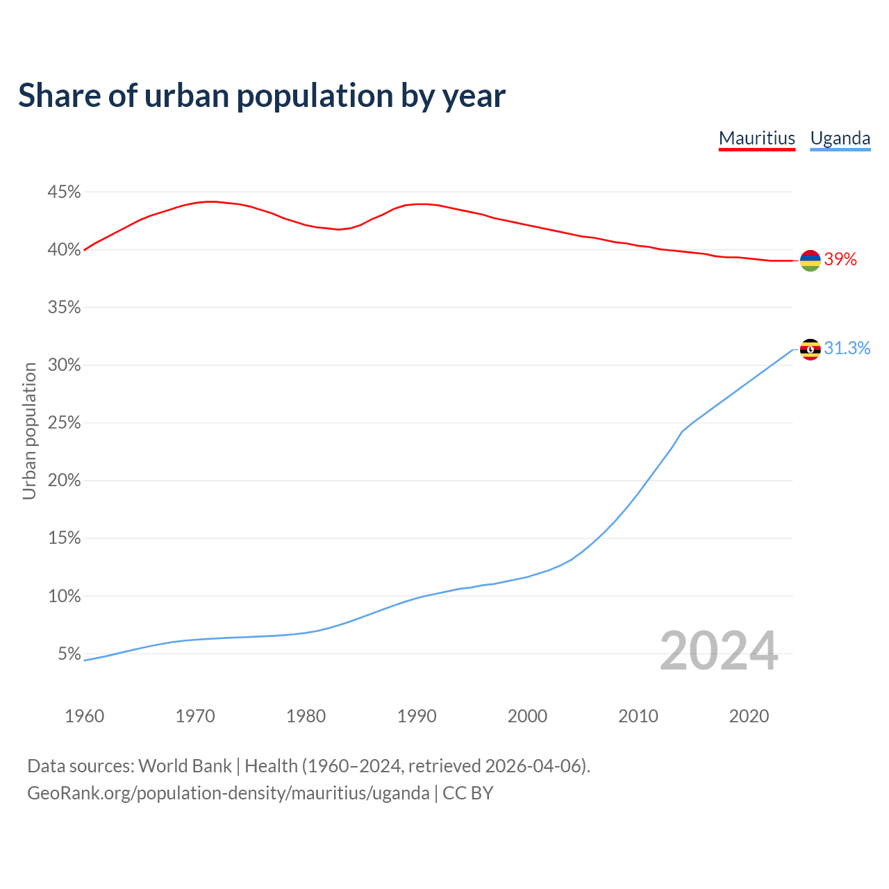 From 2004 to 2024, the share of urban population changed from 41.3% to 39% in Mauritius and from 13.1% to 31.3% in Uganda.