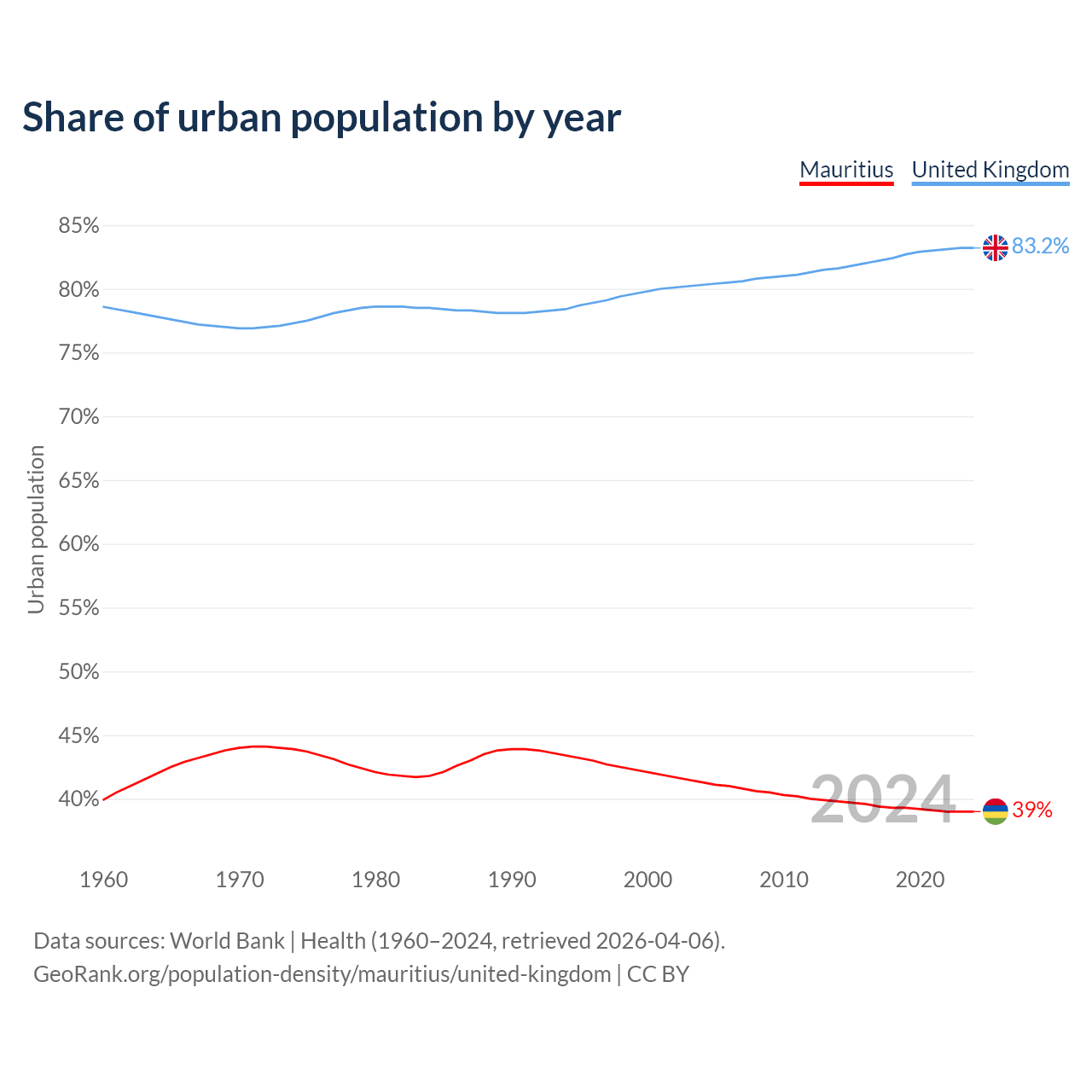 From 2004 to 2024, the share of urban population changed from 41.3% to 39% in Mauritius and from 80.3% to 83.2% in the United Kingdom.