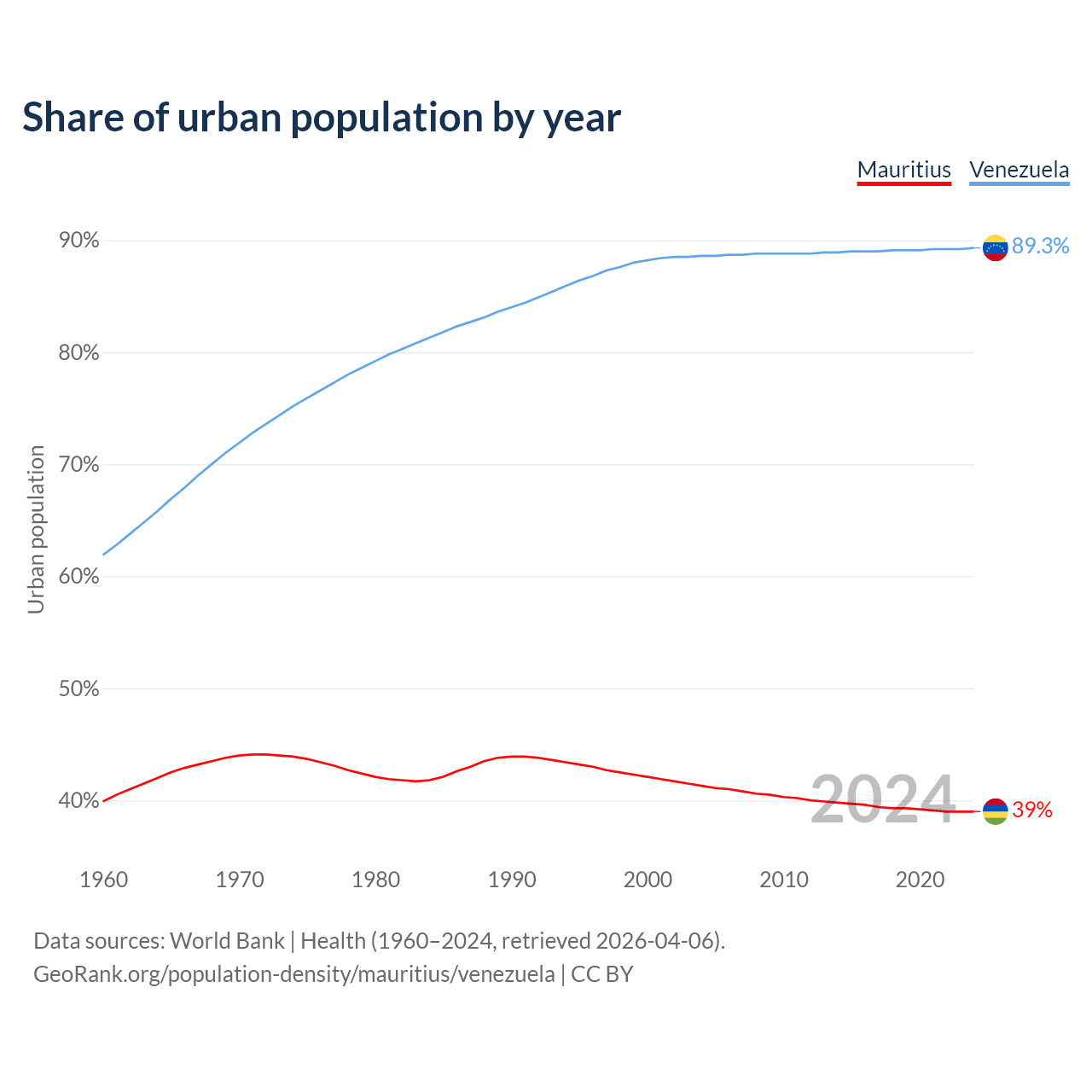 From 2004 to 2024, the share of urban population changed from 41.3% to 39% in Mauritius and from 88.6% to 89.3% in Venezuela.
