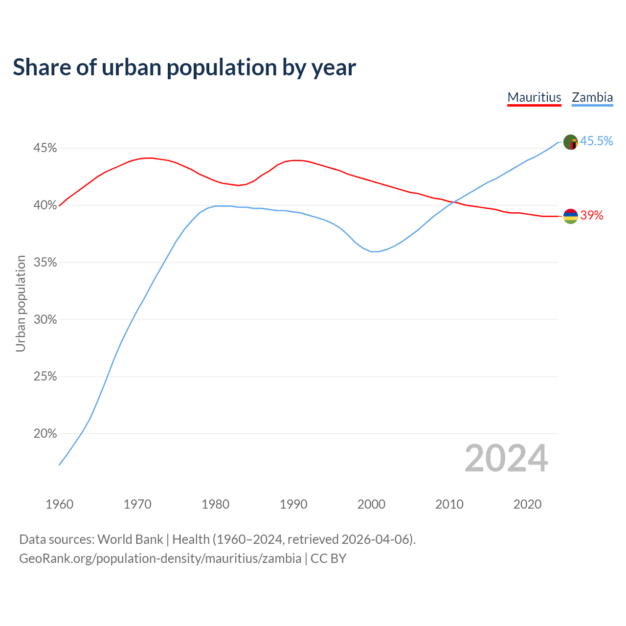 From 2004 to 2024, the share of urban population changed from 41.3% to 39% in Mauritius and from 36.8% to 45.5% in Zambia.