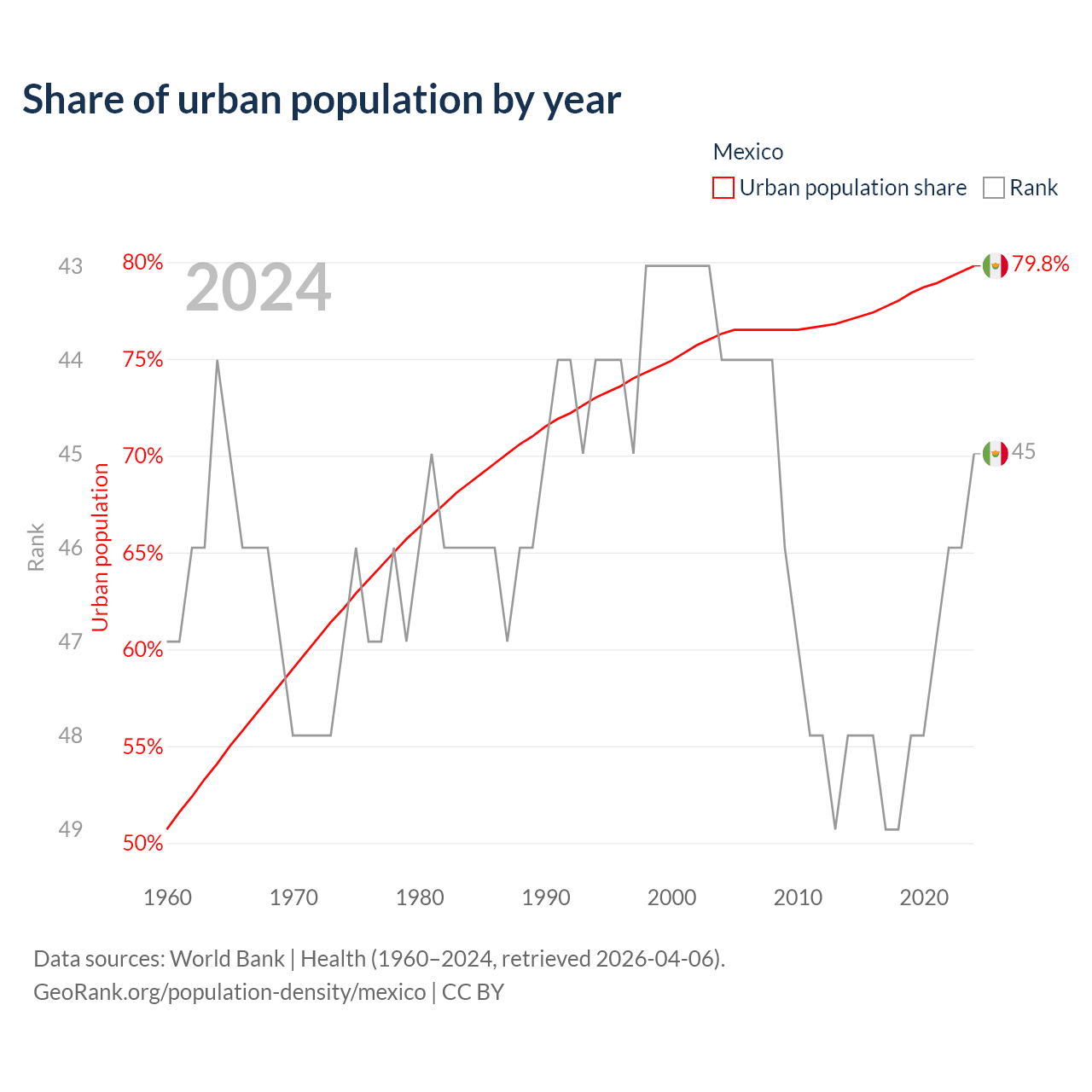 This chart shows the share of urban population in Mexico from 1960 to 2024: 50.7% lived in urban areas in 1960, 74.9% in 2000, and 79.8% in 2024.