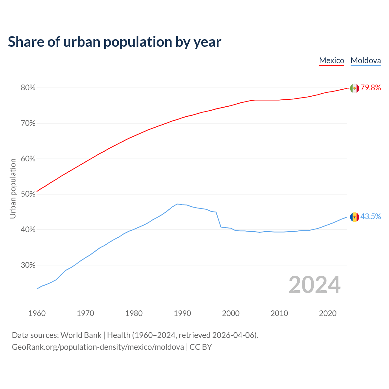 From 2004 to 2024, the share of urban population changed from 76.3% to 79.8% in Mexico and from 39.4% to 43.5% in Moldova.