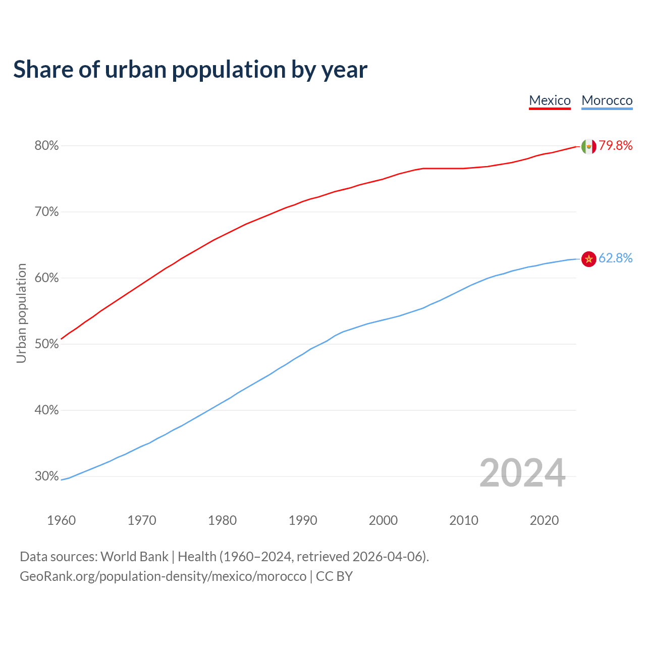 From 2004 to 2024, the share of urban population changed from 76.3% to 79.8% in Mexico and from 55% to 62.8% in Morocco.