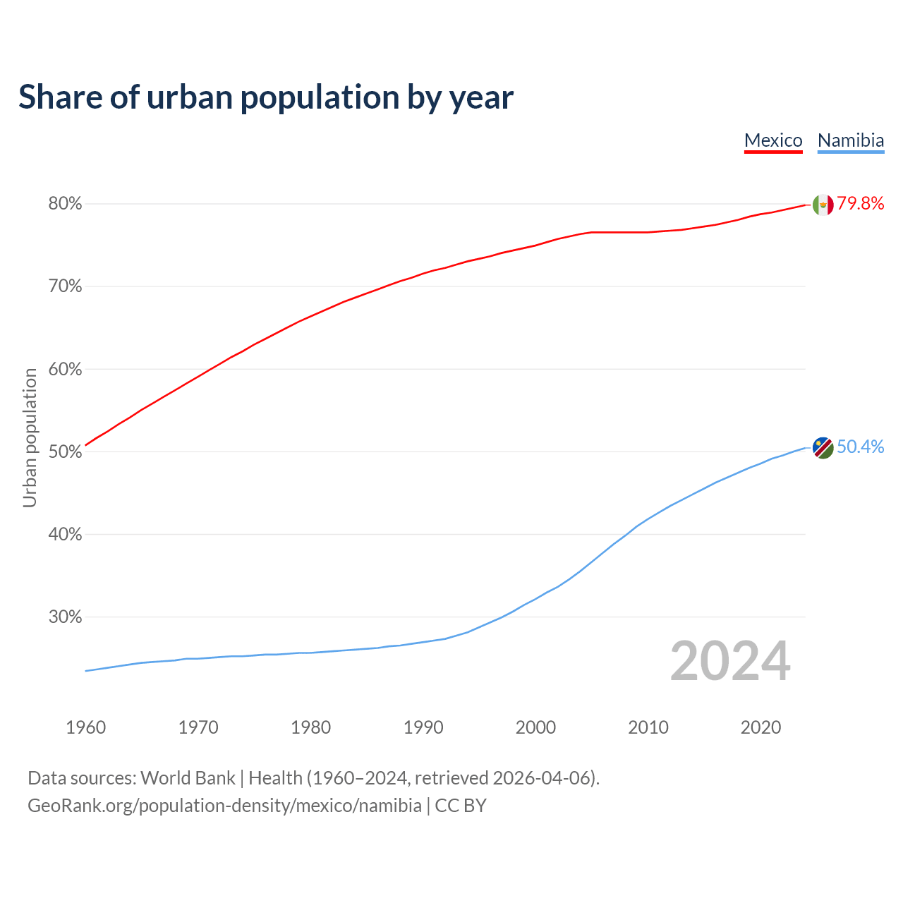 From 2004 to 2024, the share of urban population changed from 76.3% to 79.8% in Mexico and from 35.5% to 50.4% in Namibia.