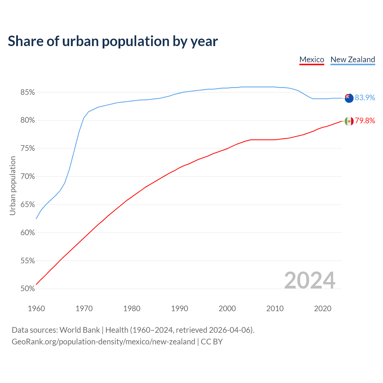 From 2004 to 2024, the share of urban population changed from 76.3% to 79.8% in Mexico and from 85.9% to 83.9% in New Zealand.