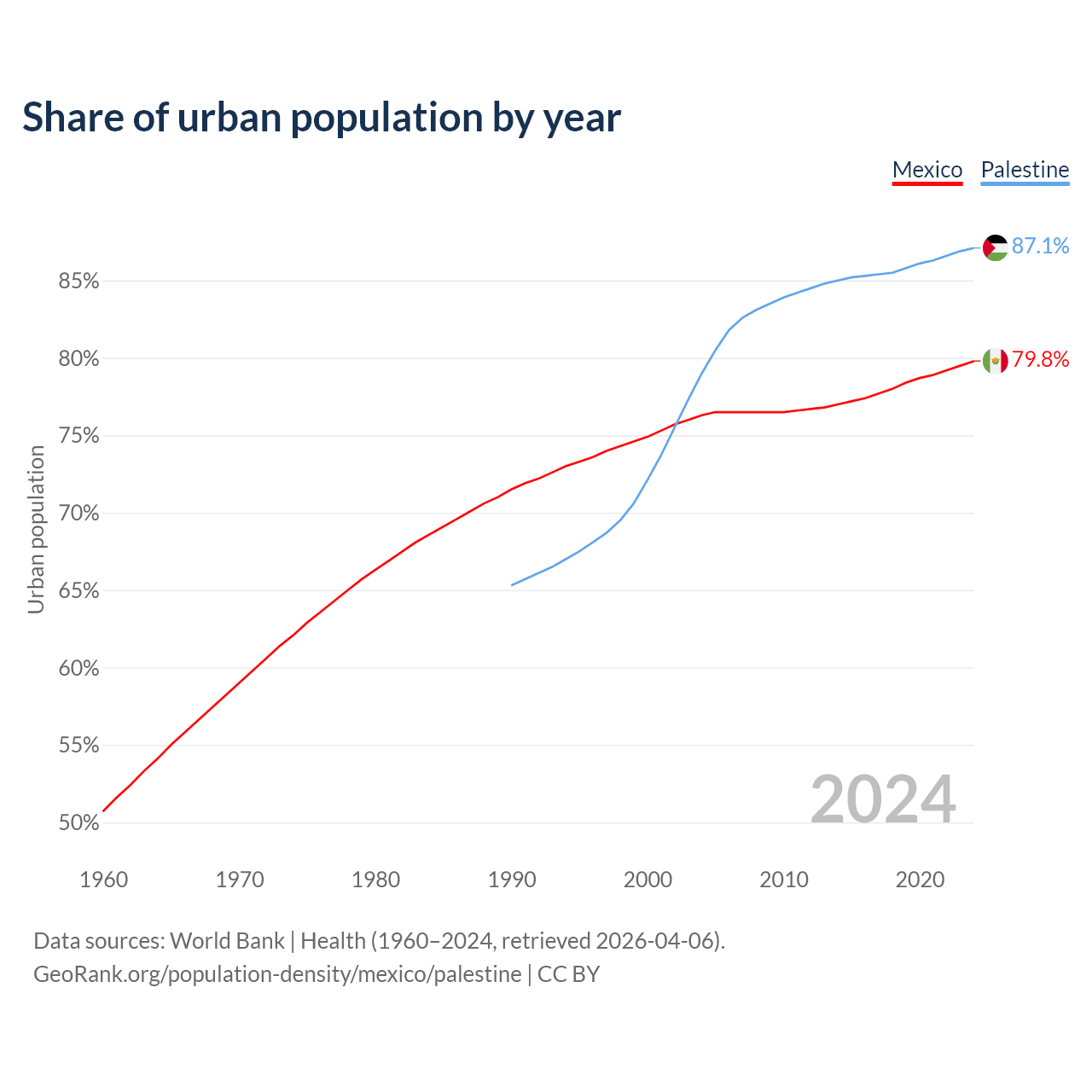 From 2004 to 2024, the share of urban population changed from 76.3% to 79.8% in Mexico and from 79% to 87.1% in Palestine.