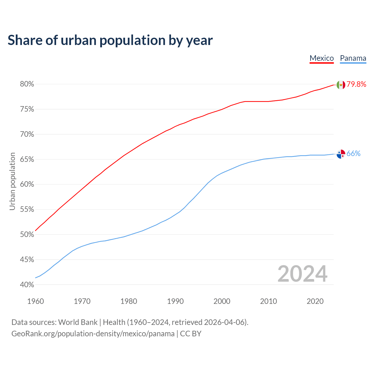 From 2004 to 2024, the share of urban population changed from 76.3% to 79.8% in Mexico and from 63.8% to 66% in Panama.