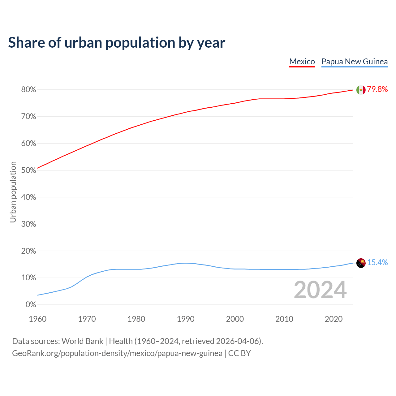 From 2004 to 2024, the share of urban population changed from 76.3% to 79.8% in Mexico and from 13.1% to 15.4% in Papua New Guinea.
