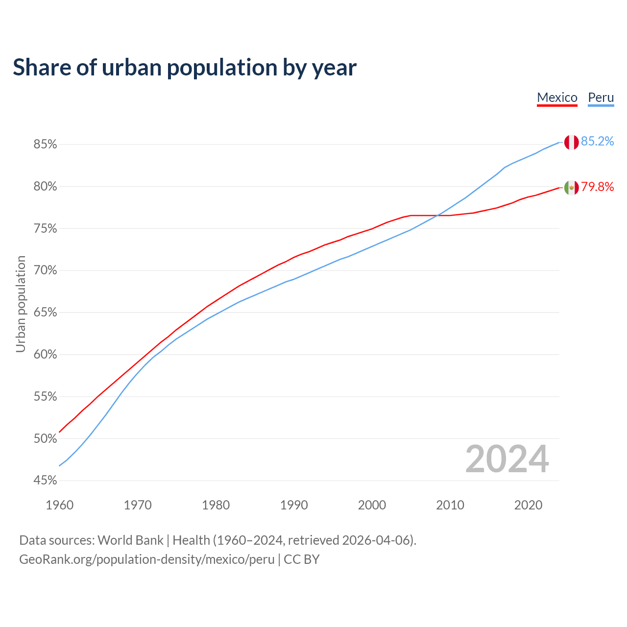 From 2004 to 2024, the share of urban population changed from 76.3% to 79.8% in Mexico and from 74.4% to 85.2% in Peru.