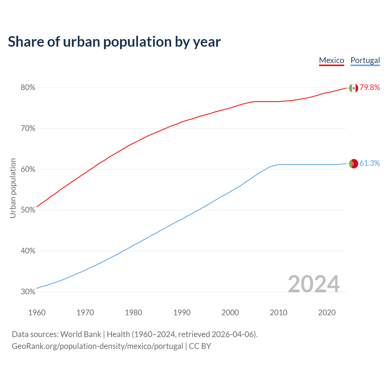From 2004 to 2024, the share of urban population changed from 76.3% to 79.8% in Mexico and from 57.4% to 61.3% in Portugal.