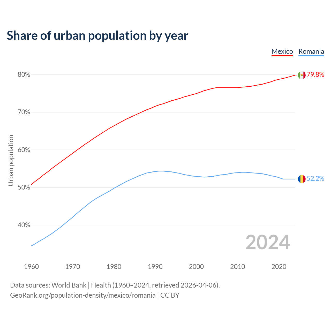 From 2004 to 2024, the share of urban population changed from 76.3% to 79.8% in Mexico and from 52.9% to 52.2% in Romania.
