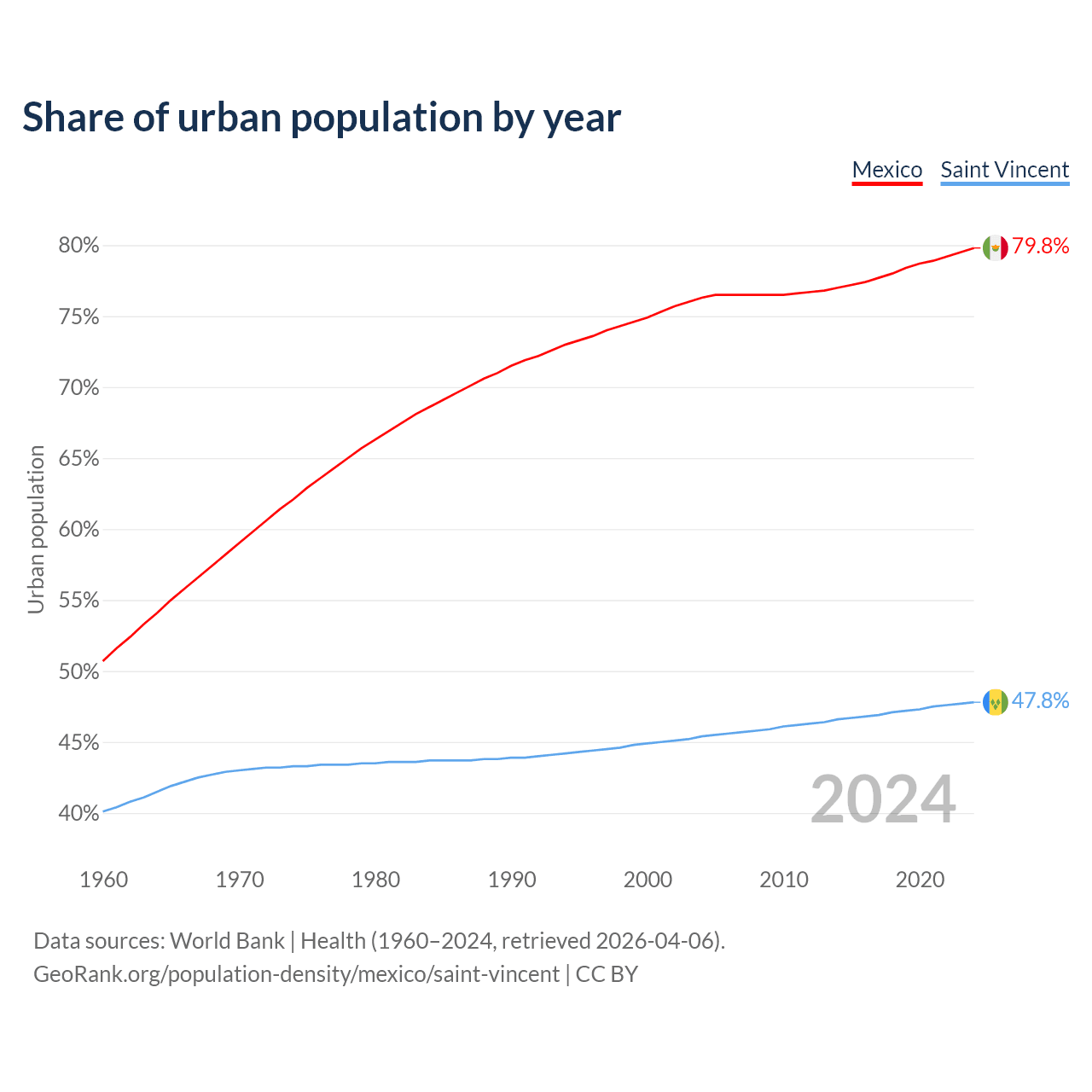From 2004 to 2024, the share of urban population changed from 76.3% to 79.8% in Mexico and from 45.4% to 47.8% in Saint Vincent.