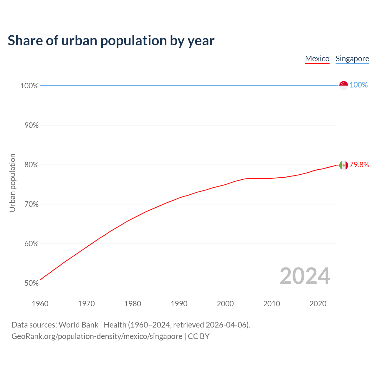 From 2004 to 2024, the share of urban population changed from 76.3% to 79.8% in Mexico and from 100% to 100% in Singapore.