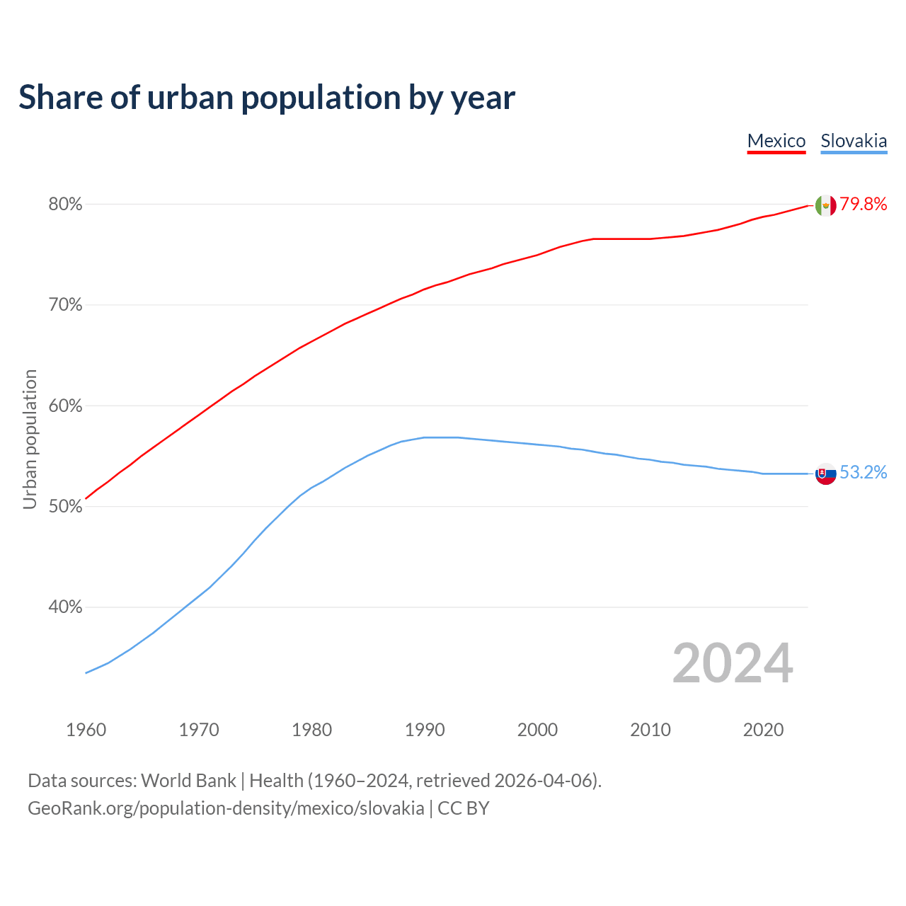 From 2004 to 2024, the share of urban population changed from 76.3% to 79.8% in Mexico and from 55.6% to 53.2% in Slovakia.