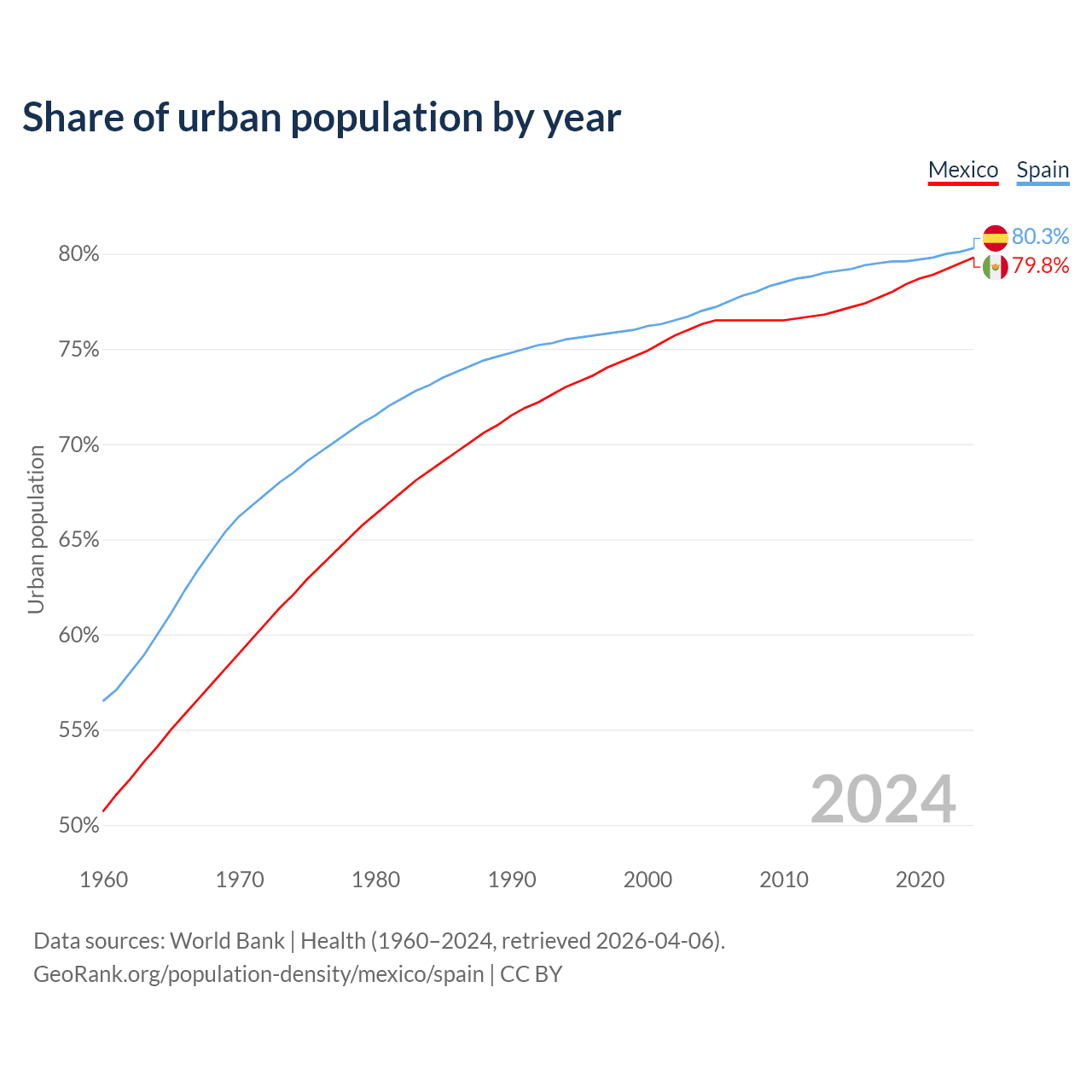 From 2004 to 2024, the share of urban population changed from 76.3% to 79.8% in Mexico and from 77% to 80.3% in Spain.