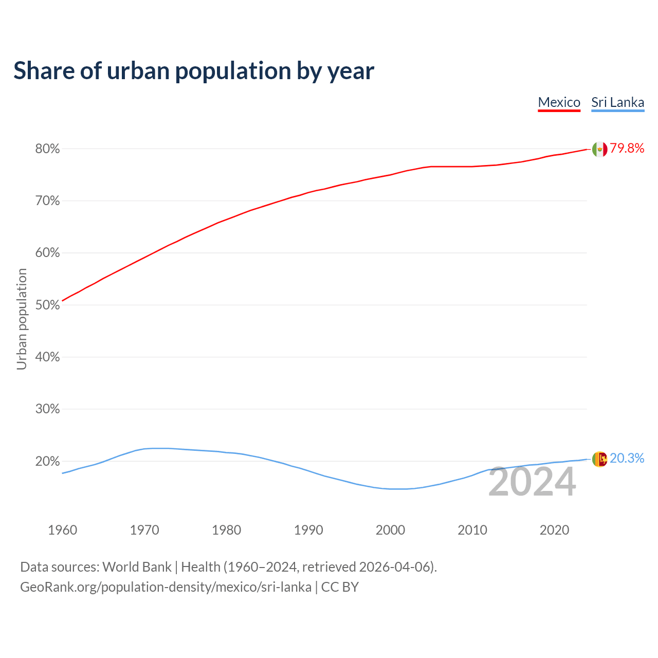 From 2004 to 2024, the share of urban population changed from 76.3% to 79.8% in Mexico and from 14.9% to 20.3% in Sri Lanka.