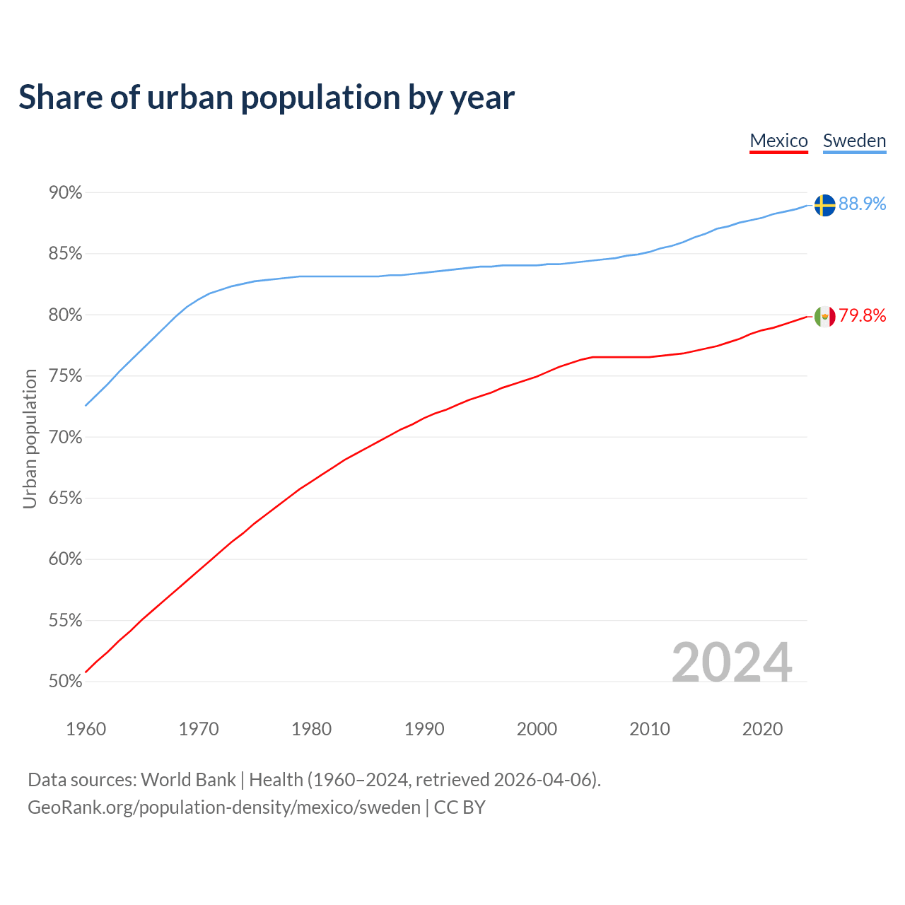 From 2004 to 2024, the share of urban population changed from 76.3% to 79.8% in Mexico and from 84.3% to 88.9% in Sweden.