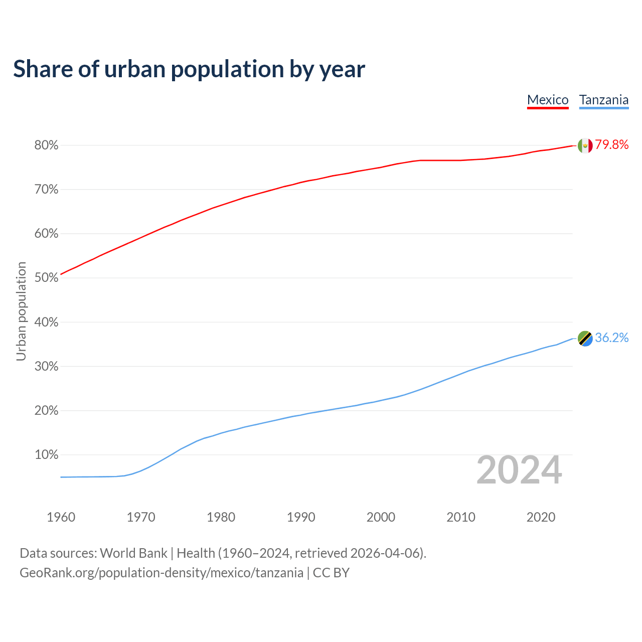 From 2004 to 2024, the share of urban population changed from 76.3% to 79.8% in Mexico and from 24.1% to 36.2% in Tanzania.