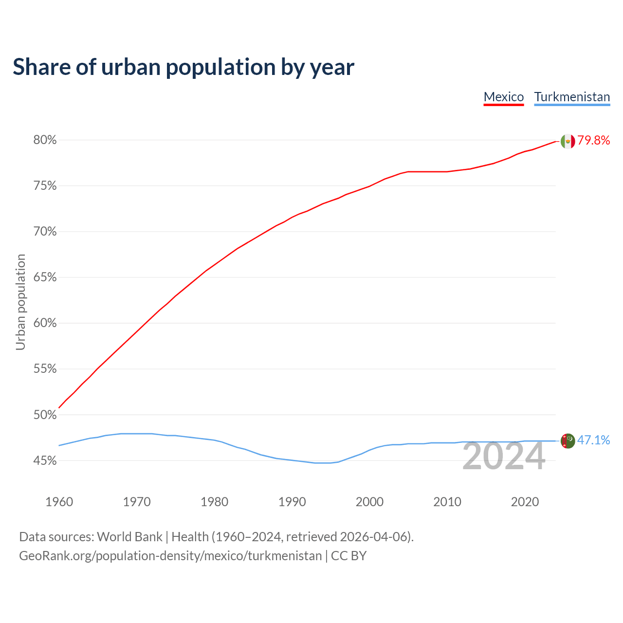 From 2004 to 2024, the share of urban population changed from 76.3% to 79.8% in Mexico and from 46.7% to 47.1% in Turkmenistan.