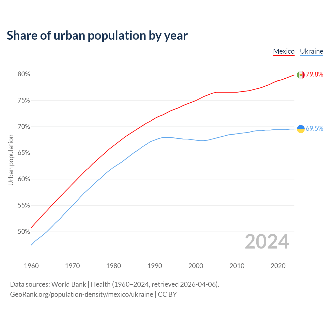 From 2004 to 2024, the share of urban population changed from 76.3% to 79.8% in Mexico and from 67.6% to 69.5% in Ukraine.