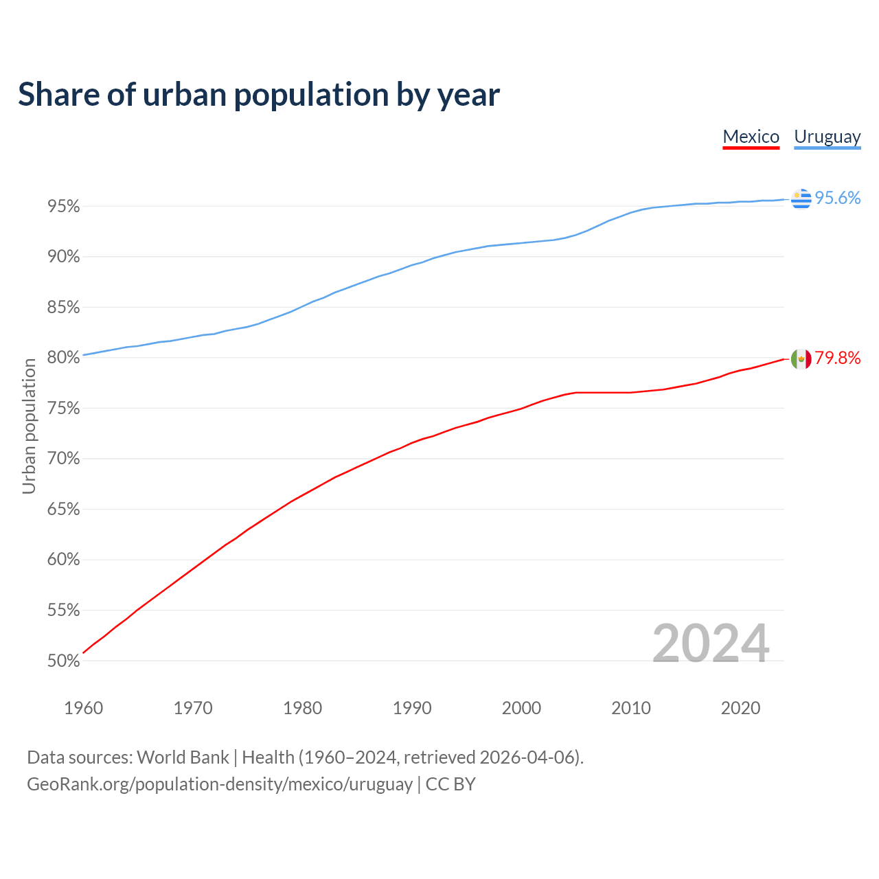 From 2004 to 2024, the share of urban population changed from 76.3% to 79.8% in Mexico and from 91.8% to 95.6% in Uruguay.