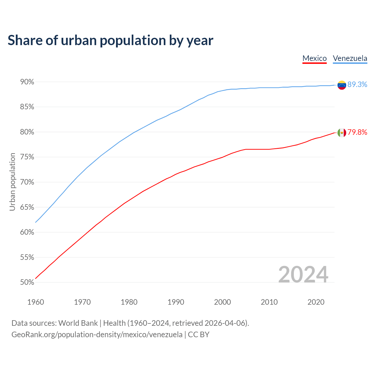 From 2004 to 2024, the share of urban population changed from 76.3% to 79.8% in Mexico and from 88.6% to 89.3% in Venezuela.