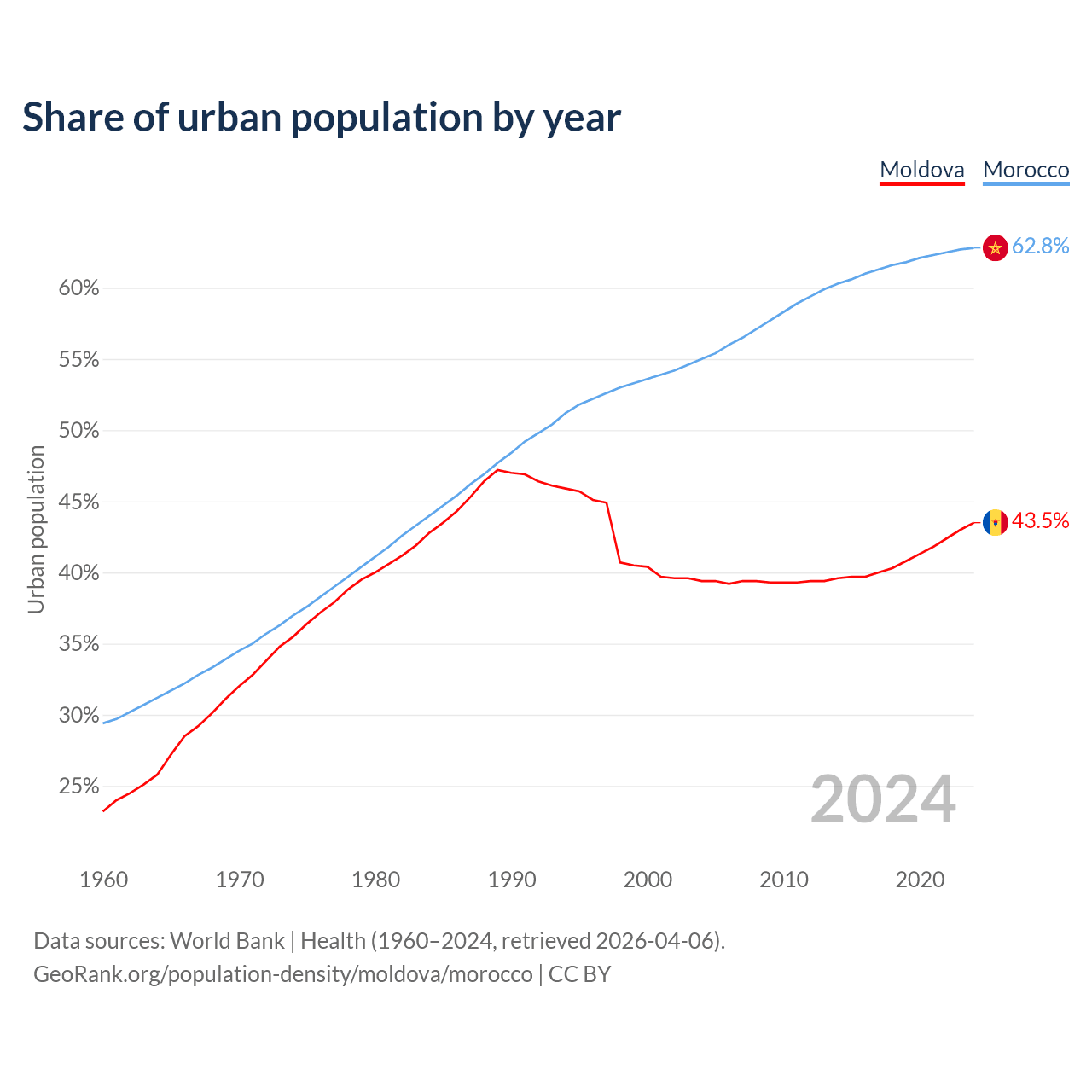 From 2004 to 2024, the share of urban population changed from 39.4% to 43.5% in Moldova and from 55% to 62.8% in Morocco.