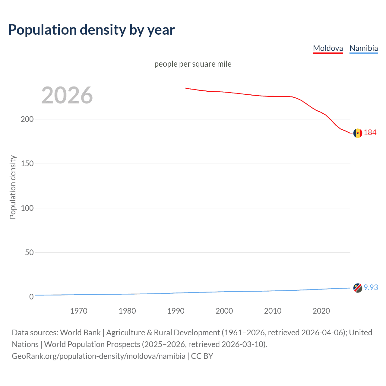 From 2006 to 2026, population density in Moldova decreased by 18.8%, compared to a 58.5% growth in Namibia.