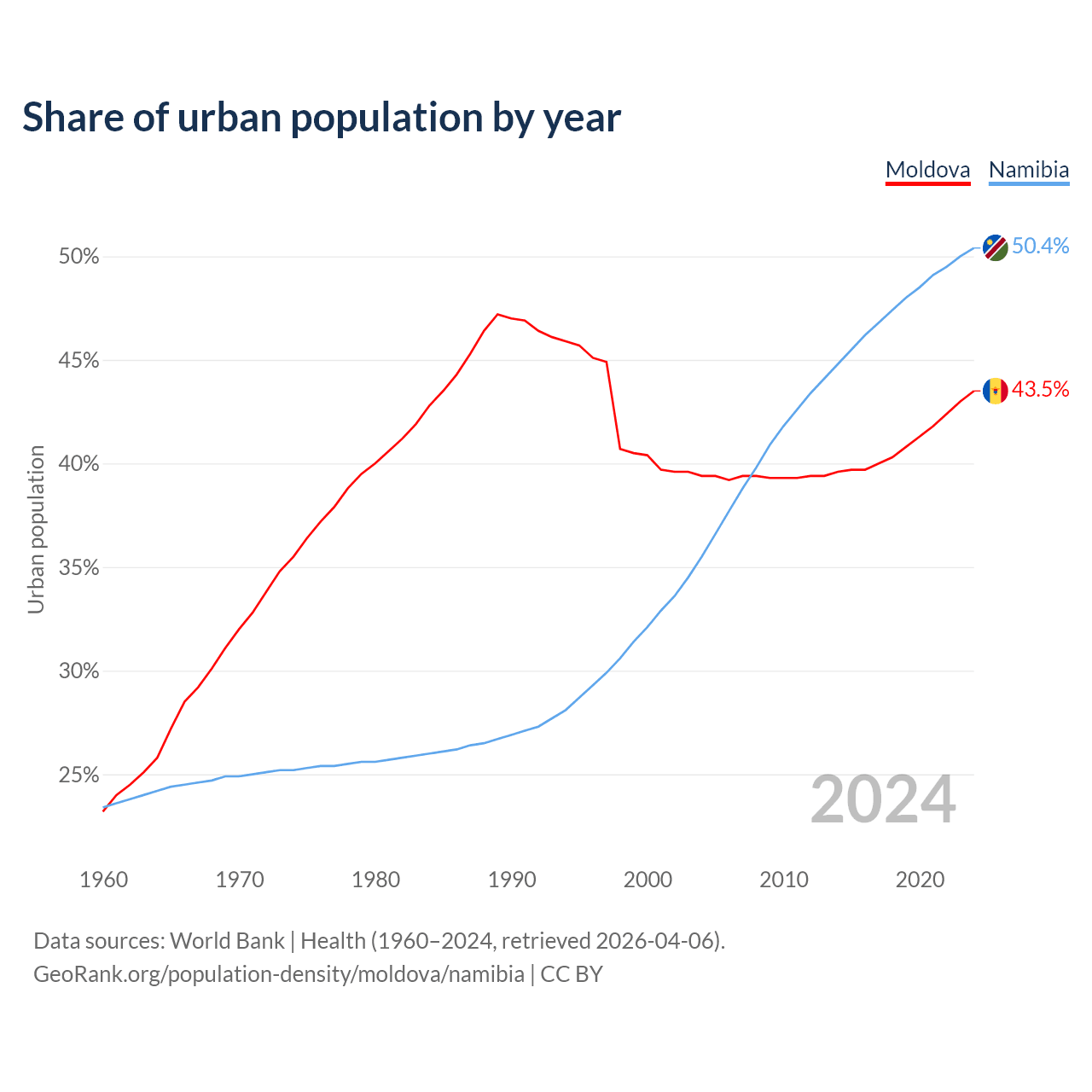 From 2004 to 2024, the share of urban population changed from 39.4% to 43.5% in Moldova and from 35.5% to 50.4% in Namibia.