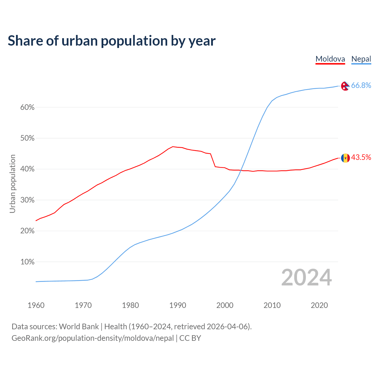 From 2004 to 2024, the share of urban population changed from 39.4% to 43.5% in Moldova and from 41.6% to 66.8% in Nepal.