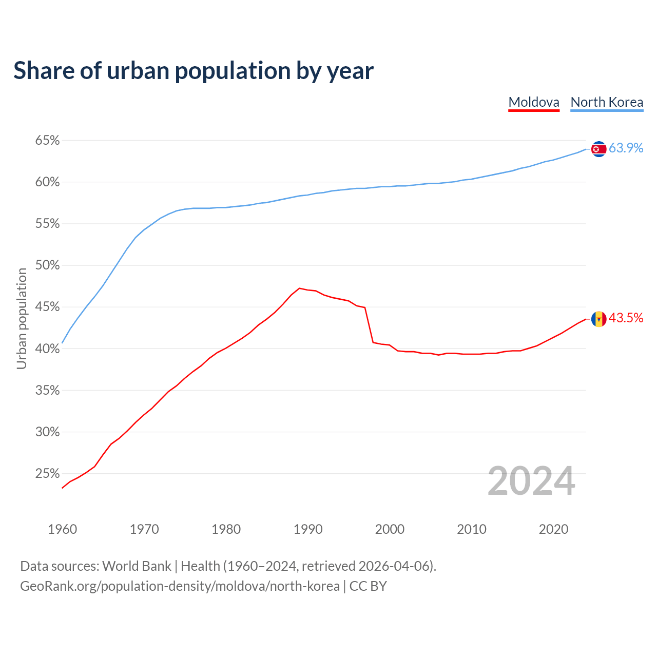From 2004 to 2024, the share of urban population changed from 39.4% to 43.5% in Moldova and from 59.7% to 63.9% in North Korea.