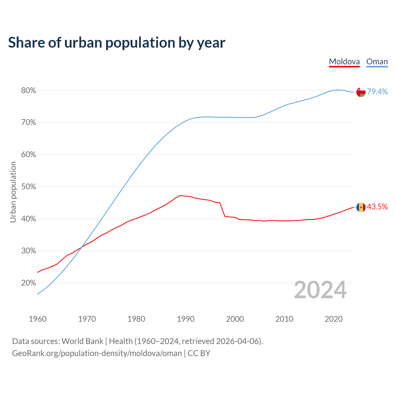 From 2004 to 2024, the share of urban population changed from 39.4% to 43.5% in Moldova and from 71.5% to 79.4% in Oman.