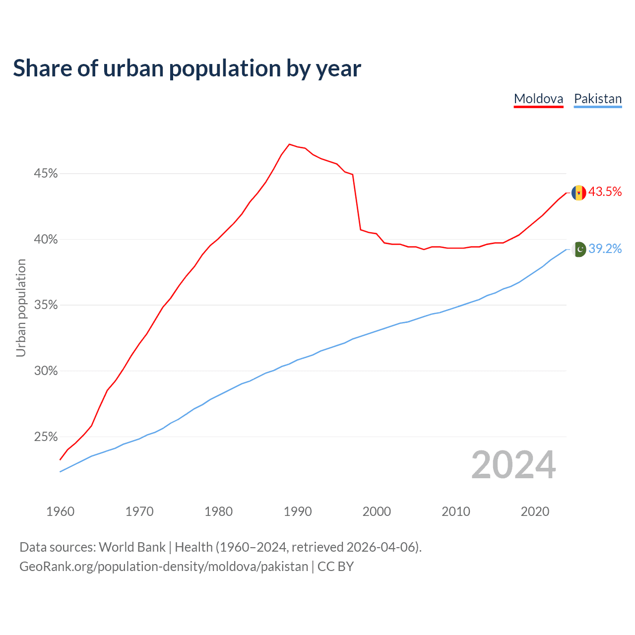 From 2004 to 2024, the share of urban population changed from 39.4% to 43.5% in Moldova and from 33.7% to 39.2% in Pakistan.