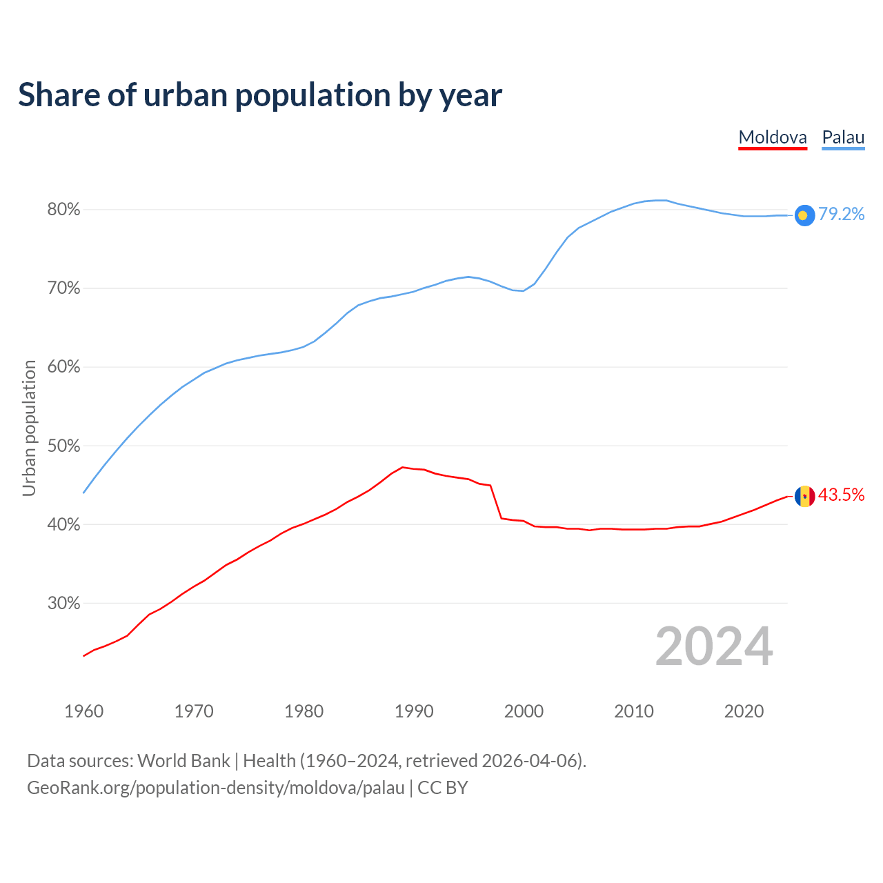 From 2004 to 2024, the share of urban population changed from 39.4% to 43.5% in Moldova and from 76.4% to 79.2% in Palau.
