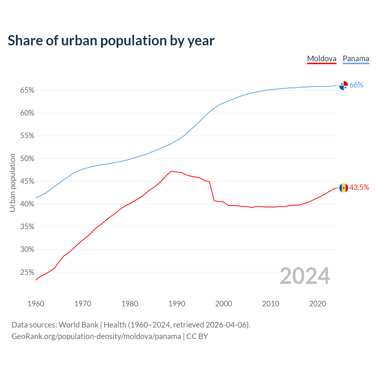 From 2004 to 2024, the share of urban population changed from 39.4% to 43.5% in Moldova and from 63.8% to 66% in Panama.