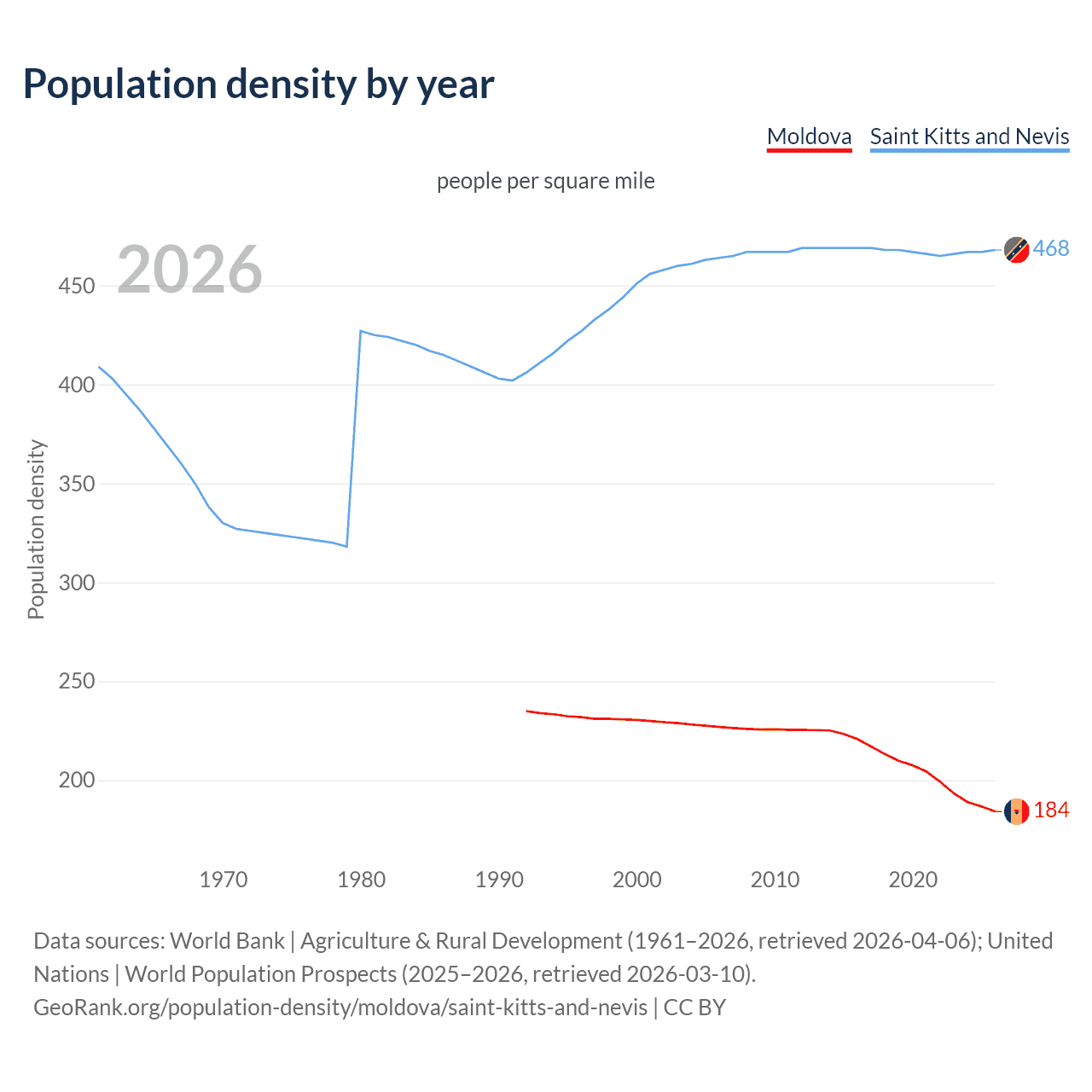 From 2006 to 2026, population density in Moldova decreased by 18.8%, compared to a 0.93% growth in Saint Kitts and Nevis.