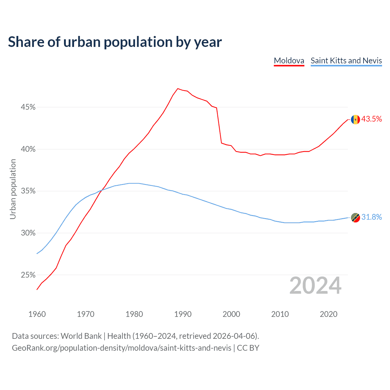 From 2004 to 2024, the share of urban population changed from 39.4% to 43.5% in Moldova and from 32.1% to 31.8% in Saint Kitts and Nevis.