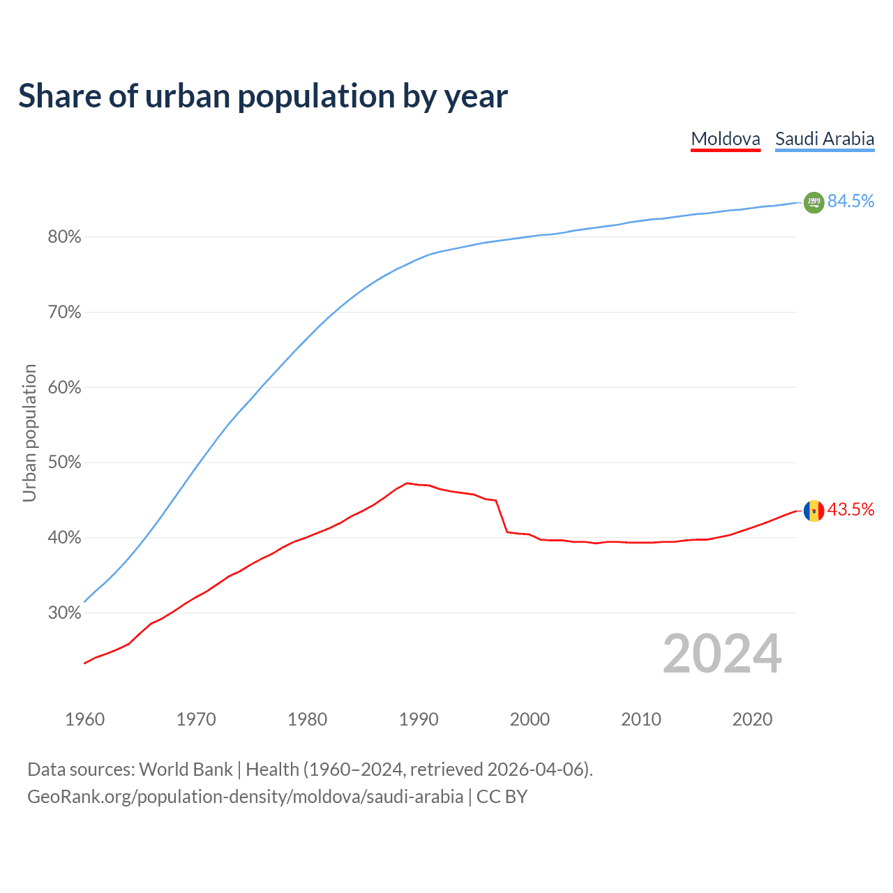 From 2004 to 2024, the share of urban population changed from 39.4% to 43.5% in Moldova and from 80.8% to 84.5% in Saudi Arabia.