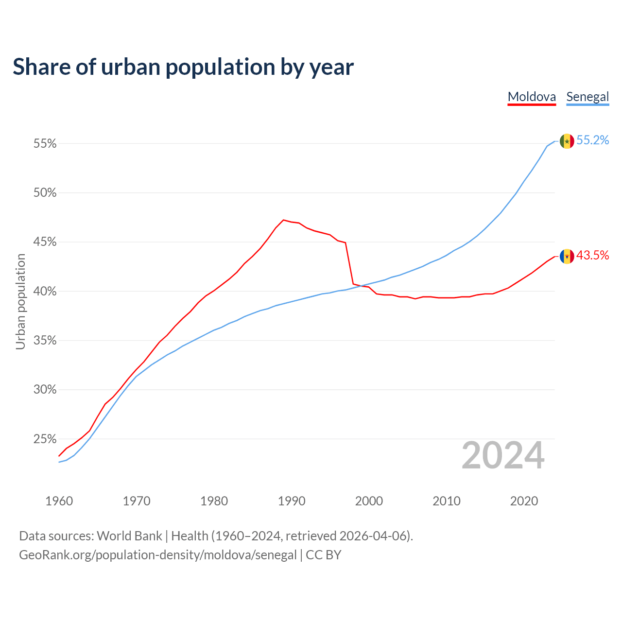 From 2004 to 2024, the share of urban population changed from 39.4% to 43.5% in Moldova and from 41.6% to 55.2% in Senegal.