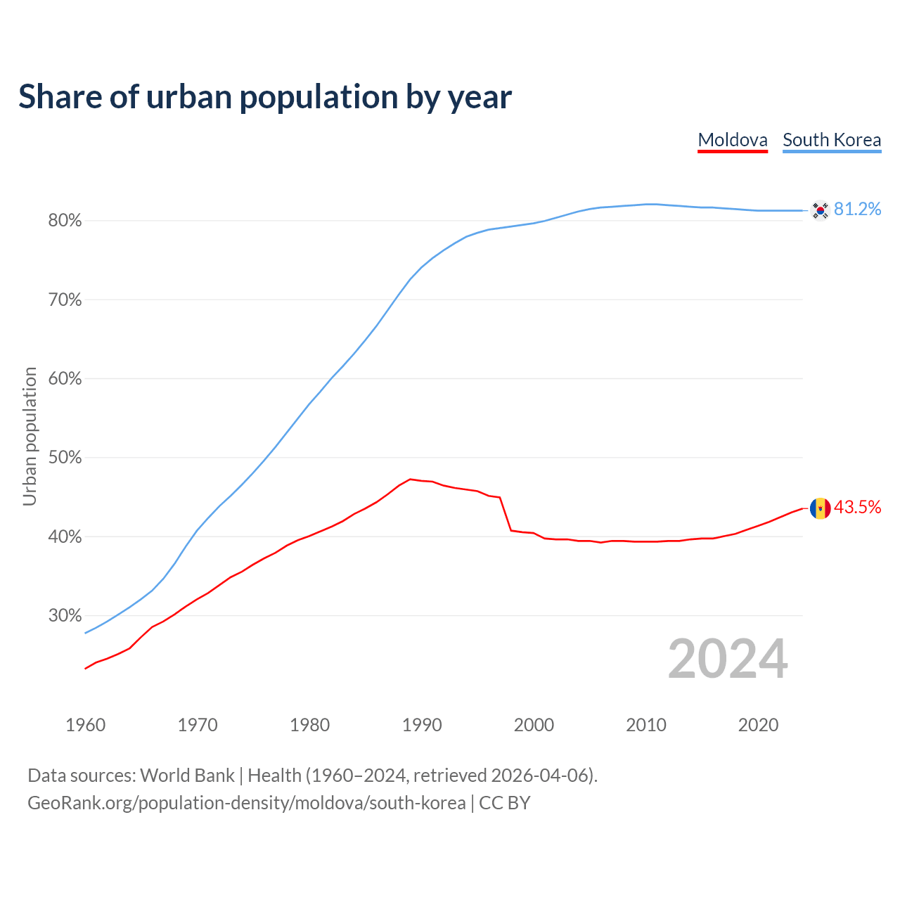 From 2004 to 2024, the share of urban population changed from 39.4% to 43.5% in Moldova and from 81.1% to 81.2% in South Korea.