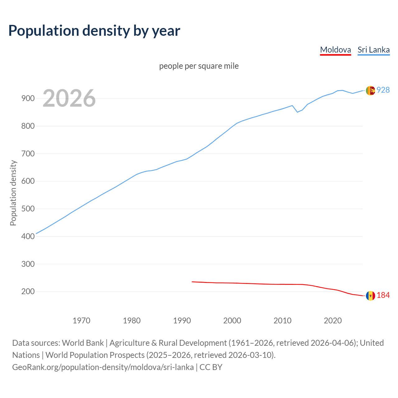 From 2006 to 2026, population density in Moldova decreased by 18.8%, compared to a 10.4% growth in Sri Lanka.