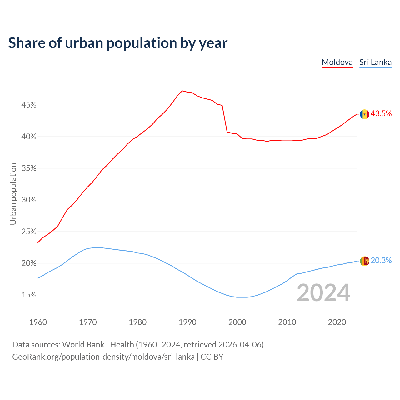 From 2004 to 2024, the share of urban population changed from 39.4% to 43.5% in Moldova and from 14.9% to 20.3% in Sri Lanka.