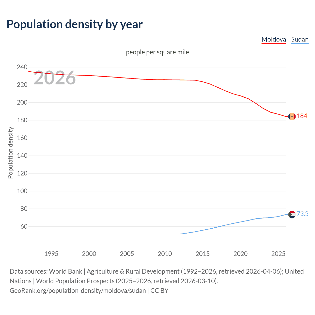 From 2012 to 2026, population density in Moldova decreased by 18.3%, compared to a 43.3% growth in Sudan.