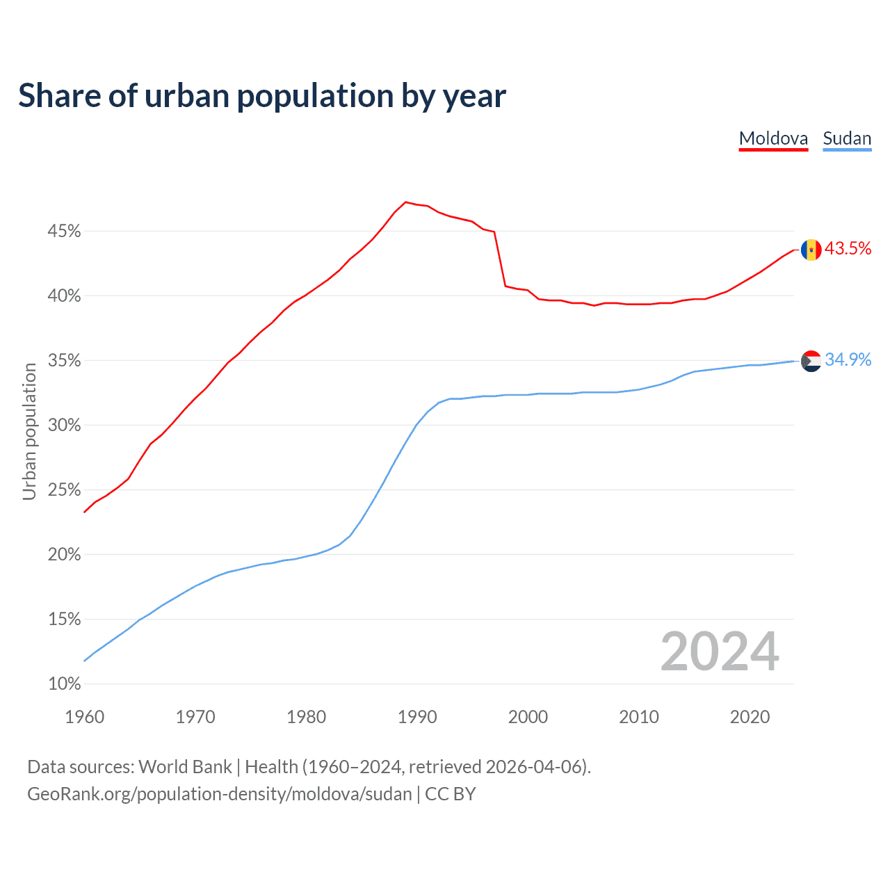 From 2004 to 2024, the share of urban population changed from 39.4% to 43.5% in Moldova and from 32.4% to 34.9% in Sudan.