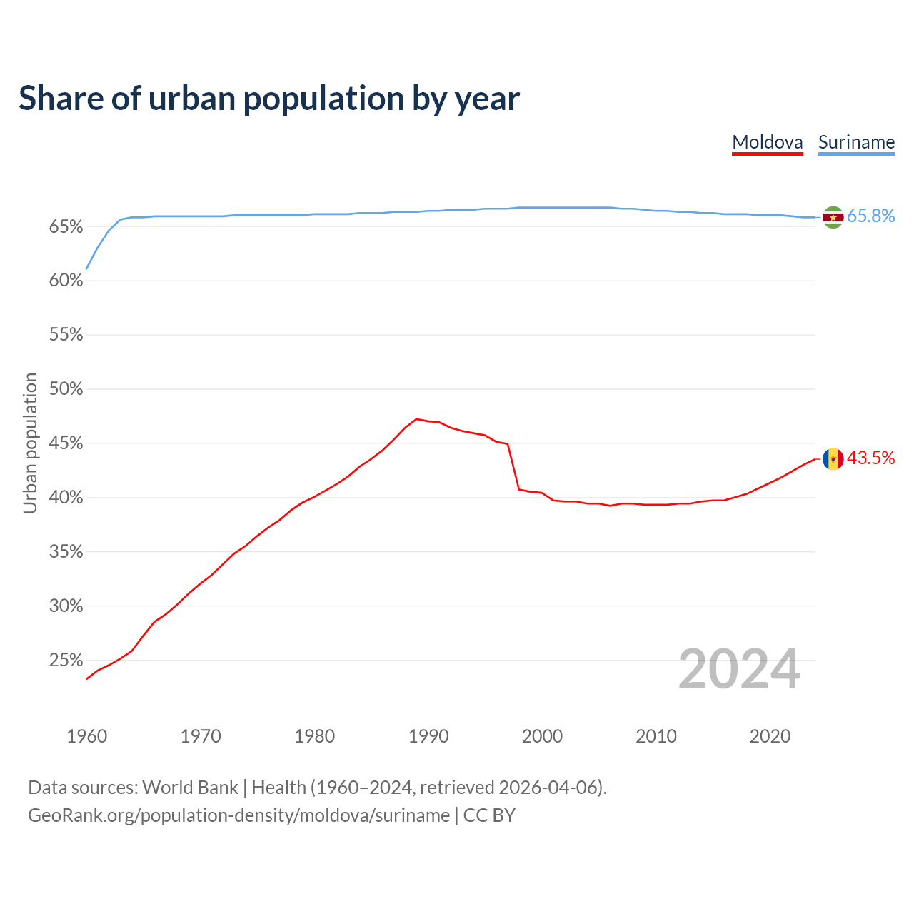 From 2004 to 2024, the share of urban population changed from 39.4% to 43.5% in Moldova and from 66.7% to 65.8% in Suriname.