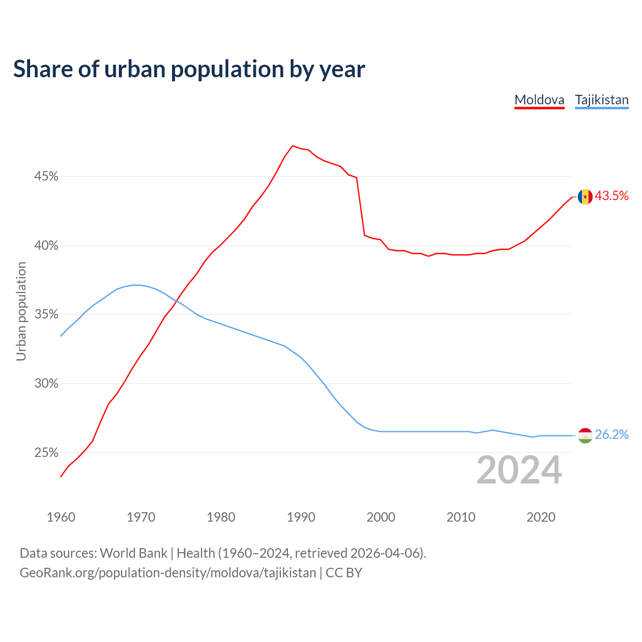 From 2004 to 2024, the share of urban population changed from 39.4% to 43.5% in Moldova and from 26.5% to 26.2% in Tajikistan.
