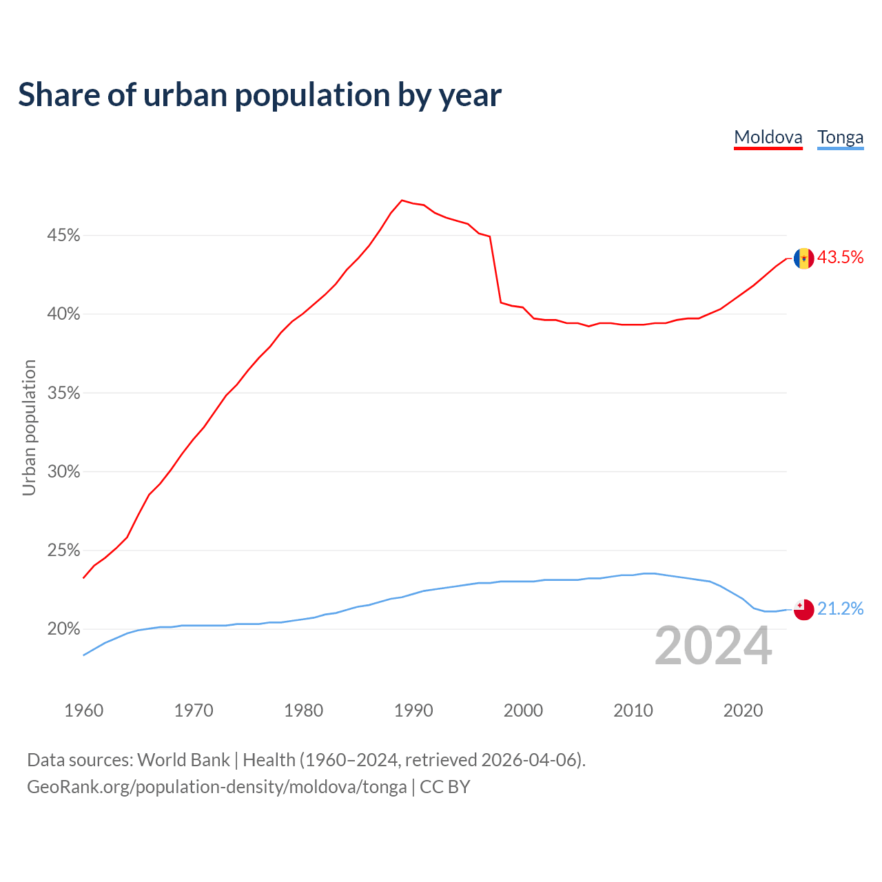From 2004 to 2024, the share of urban population changed from 39.4% to 43.5% in Moldova and from 23.1% to 21.2% in Tonga.