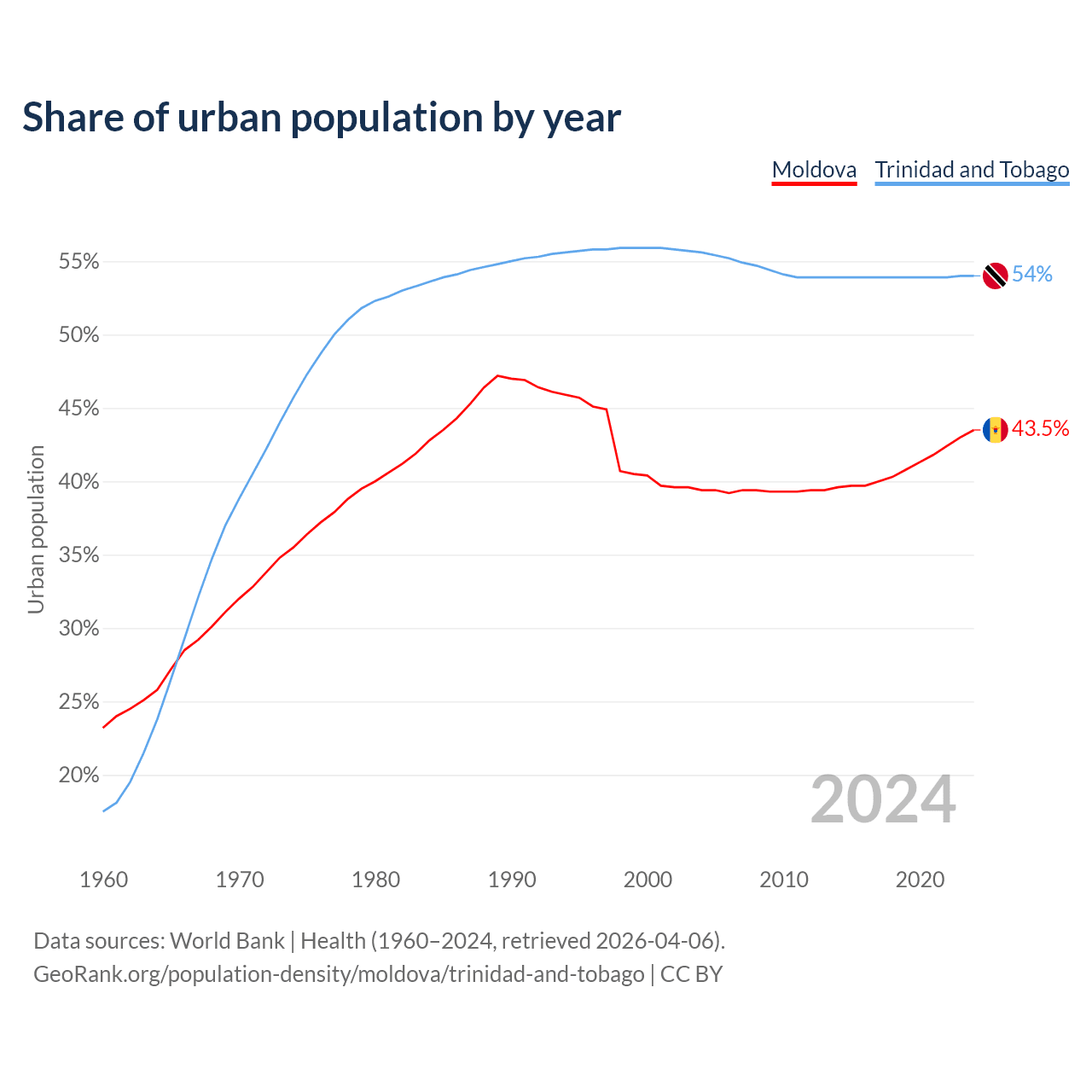 From 2004 to 2024, the share of urban population changed from 39.4% to 43.5% in Moldova and from 55.6% to 54% in Trinidad and Tobago.