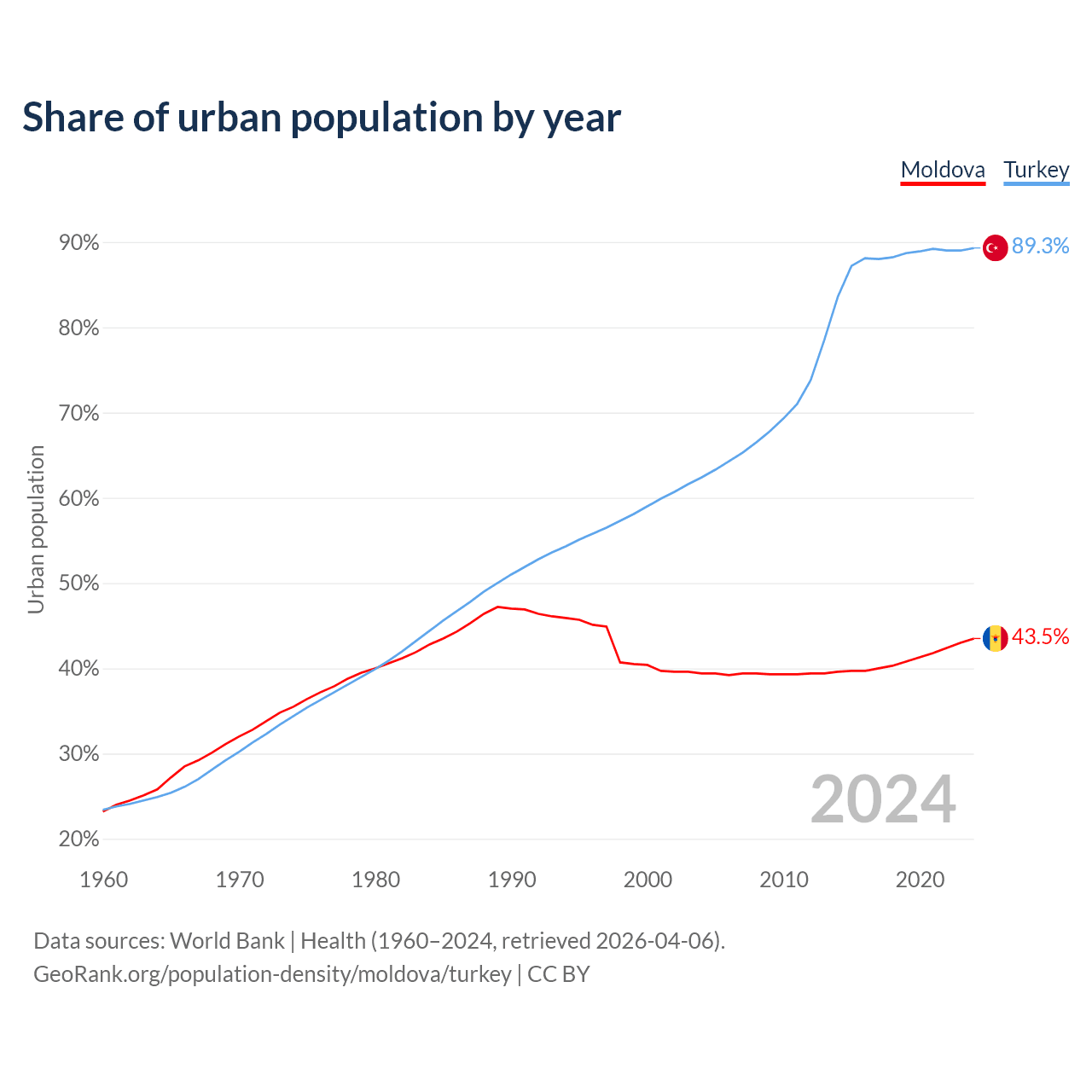 From 2004 to 2024, the share of urban population changed from 39.4% to 43.5% in Moldova and from 62.4% to 89.3% in Turkey.